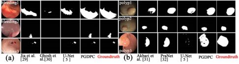 3.2:基于模式識別的病灶區(qū)域分割方法。利用模式識別領域的聚類算法,實現(xiàn)對任意來源數(shù)據(jù)集的高效圖像分割。利用此類方法得到的系統(tǒng)具有高靈活性,低復雜度。下圖中展示了出血和息肉的分割結(jié)果。主要成果: