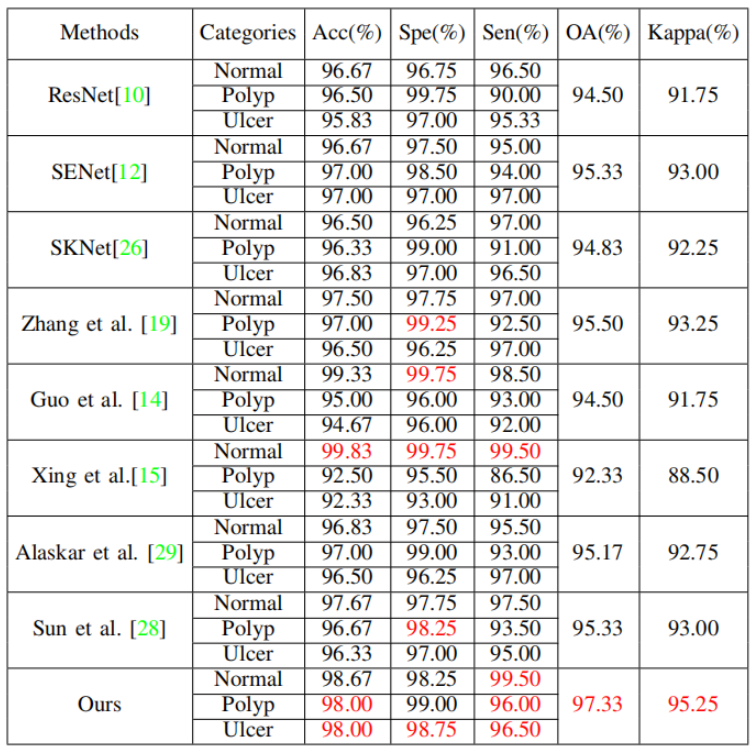 2.1: 利用特征模型的方法實現(xiàn)腸道中常見疾病分類,分為健康、息肉和潰瘍?nèi)悾?strong>成果:先驗權重共享碼本下內(nèi)窺鏡圖像大腸病變分類,中國圖象圖形學報,2021. vol 6,性能如下: